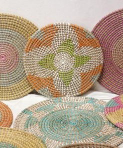 Handwoven from seagrass by artisans in Vietnam, this set of wall decor discs features vibrant designs in uplifting shades of colors. Complete with a hanging loop, they liven up any space in your house either hung individually or grouped into an eye-catching display.